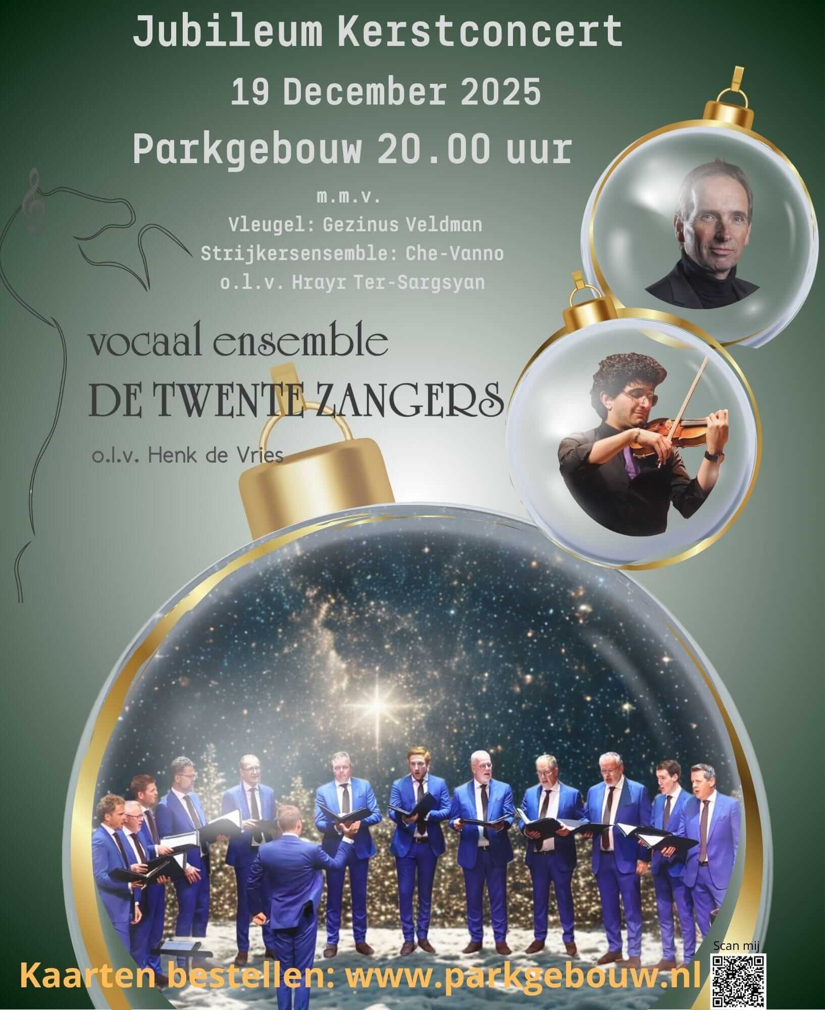 Parkgebouw Oosterhofweg 49, RijssenDeze avond geeft vocaal ensemble De Twente Zangers hun traditionele kerstconcert. Samen met de veelgevraagde pianist Gezinus Veldman en strijkensemble Che-Vanno staan zij garant voor een geslaagd concert. Het ensemble staat onder begeleiding van dirigent Henk de Vries.